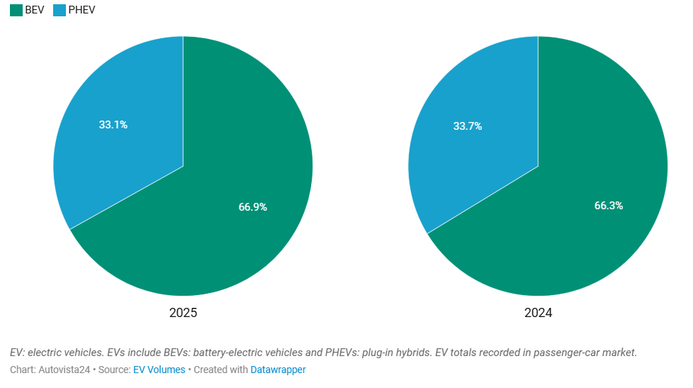 Jednak w pierwszej połowie 2025 roku udział BEV w rynku EV wzrósł o 0,6 punktu procentowego, osiągając dominującą wartość 66,9%. W rezultacie PHEV stanowiły 33,1% wszystkich dostaw.