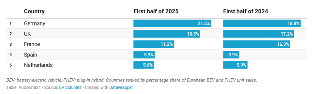 W okresie od stycznia do czerwca Niemcy odnotowały największą sprzedaż pojazdów elektrycznych w Europie. Kraj ten odpowiadał za 21,5% wszystkich sprzedaży pojazdów typu plug-in w regionie, co oznacza wzrost o 2,7 punktu procentowego w porównaniu z rokiem ubiegłym. Wielka Brytania również odnotowała wysokie wolumeny, odpowiadając za 18,5% europejskiego rynku EV, wzrastając z poprzednich 17,2%.