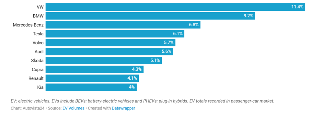 Sprzedaż EV Audi wyniosła 100 014 pojazdów, co dało 5,6% udziału w rynku w pierwszej połowie roku, spadek w porównaniu do 6,5% rok wcześniej. Ten spadek może być wynikiem sukcesu Volkswagena, który prowadzi w rankingu.